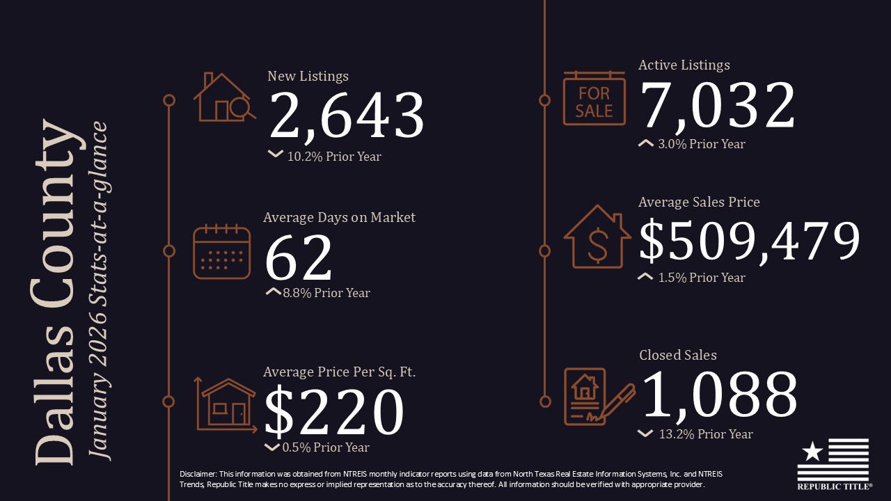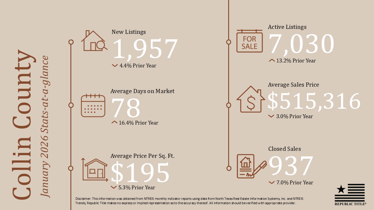 The North Texas housing market in January 2026 continued to show rising inventory levels and longer selling times, while buyer activity slowed across most counties.