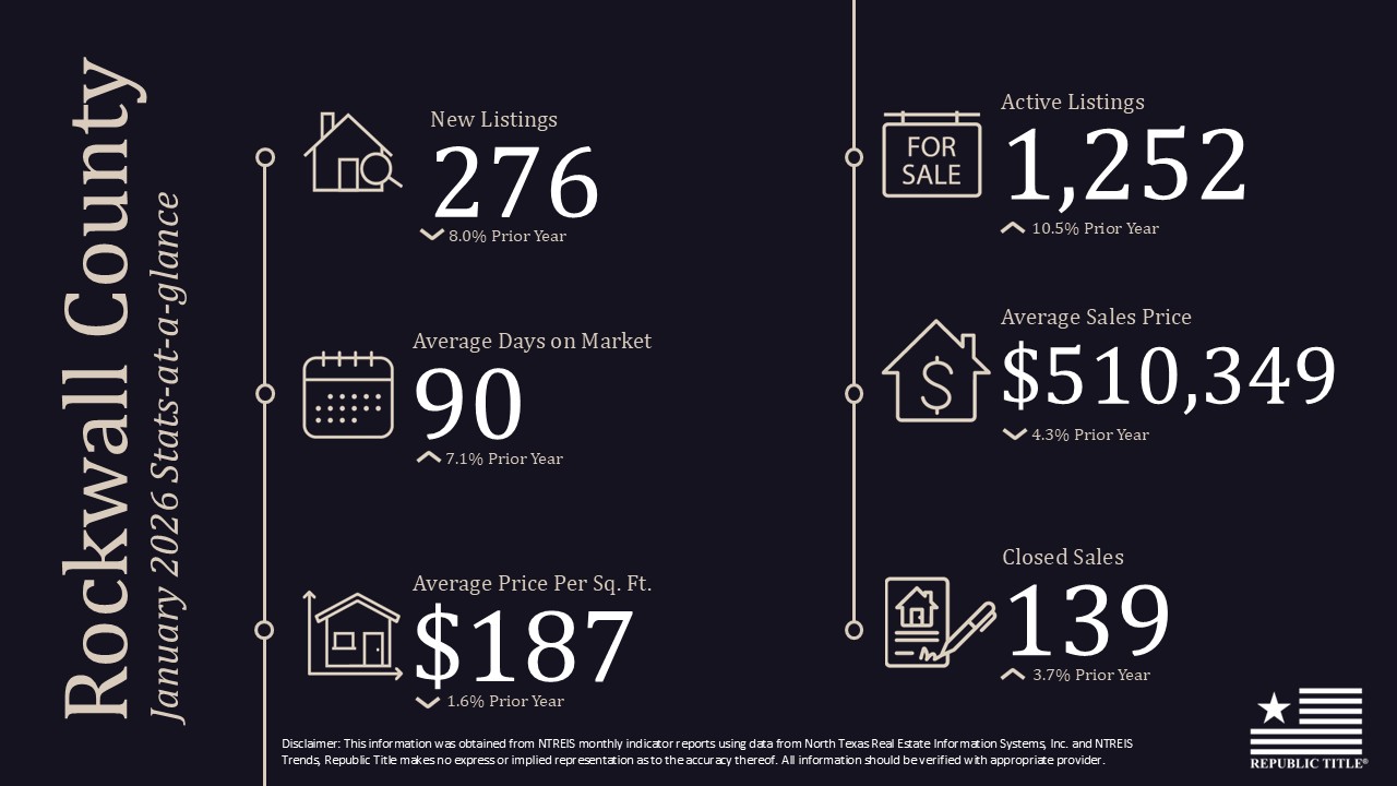 • Rockwall County reported new listings down 8.0% and days on market up 7.1%, with active listings rising 10.5%. Despite slower movement, closed sales improved by 3.7%, making it the only county with sales growth.