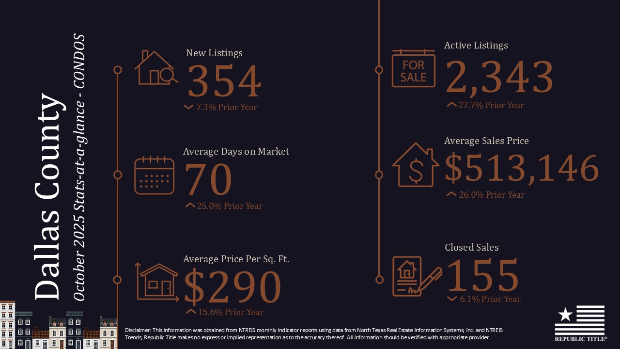 Condo inventory also grew significantly, especially in Collin County with 285 active condo listings (+34.8% YOY) and Dallas County with 2,343 active listings (+26.0% YOY). Tarrant County followed with 446 condo listings (+15.4% YOY).