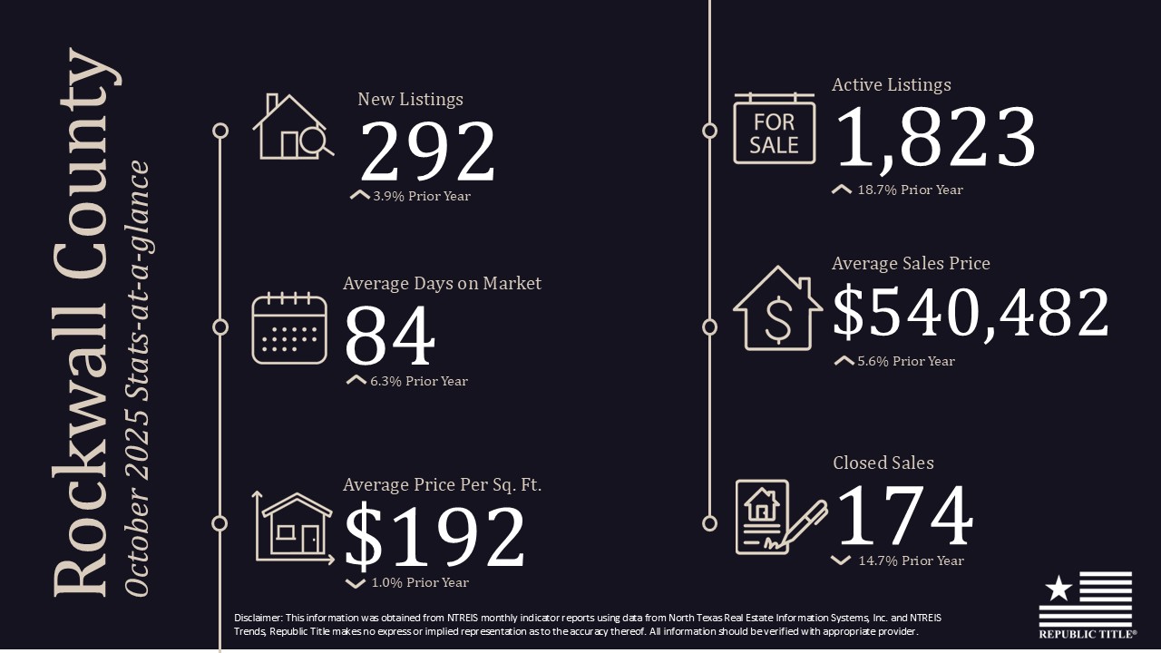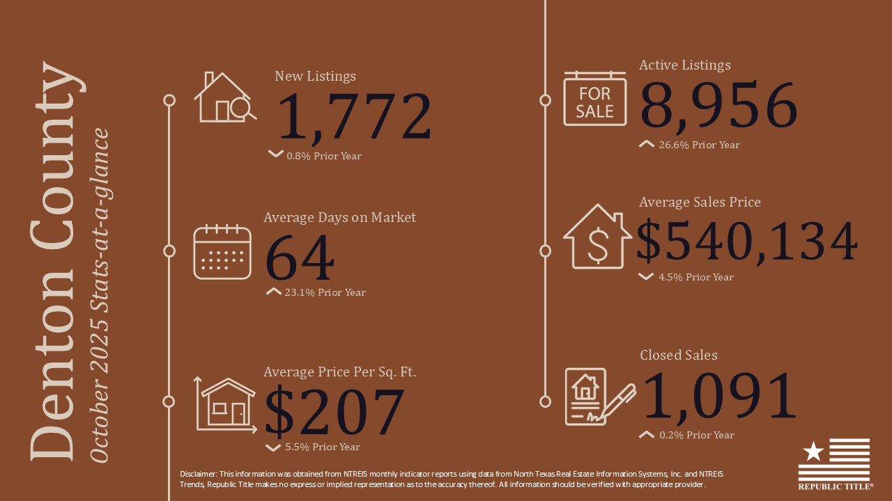 The October 2025 real estate numbers are in, and inventory continues to climb across the DFW Metroplex as we move deeper into the fall market. Active listings increased year-over-year in every major county, with Collin County up 26.6%, Dallas County up 14.2%, Denton County up 26.6%, and Tarrant County up 7.6%. More homes on the market mean more choices for buyers across all price points.